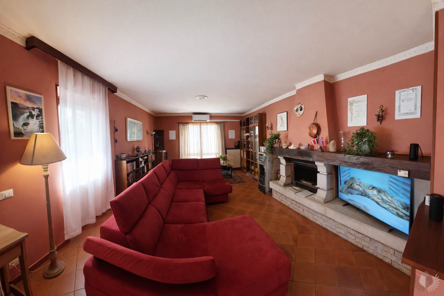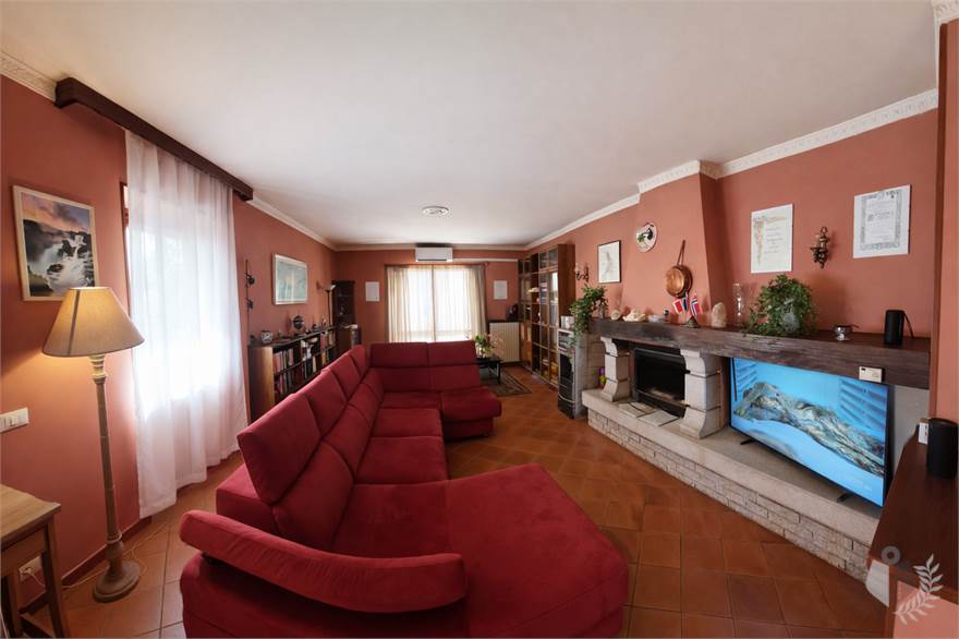 L'abitazione è disposta su due piani oltre mansardato. Al piano terreno attraverso l'importante portico si accede all'ingresso leaving sul salone dove campeggia l'importante camino, cucina abitabile tradizionale, bagno/lavanderia.